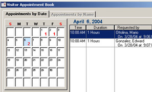 Appointment Book - Pre-authorized visitors are recorded in the appointment book. The record includes, persons whom requested and authorized visit, visitor's name, phone number, company represented, company address, telephone number and visitors classification.