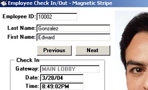 Employee positive identification and tracking - Employees are enrolled by entering name, phone, department, Id number, photo and optional fingerprint into database. The employees pass their identification card through a reader at the entrance when they enter or depart. The employee's photo, fingerprint authorization and other related data pops up on the monitor positively identifying the employee. Date/time and gate number are recorded into the database when the identification card is passed through the card reader.
