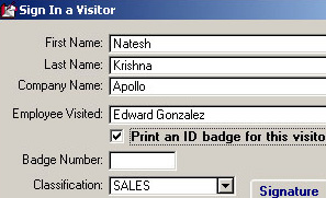 Visitor positive identification and tracking - The gate attendant enters the visitor's name phone number, destination, and takes photo, optional fingerprint. The visitor signs the electronic signature pad. A badge or label is printed out with visitor's name, photo, destination and badge number. The visitor can now pass their badge or fingerprint through a reader when entering and departing. The visitor's photo pops up on the monitor positively identifying the visitor. The date/time and gate number is recorded into the database when the identification card is passed through the card reader. Pre-authorized visits can be recorded into the Appointment book from the authorization person's office. This has the added benefit of faster sign-in with minimum data entry.